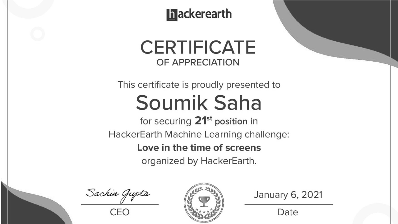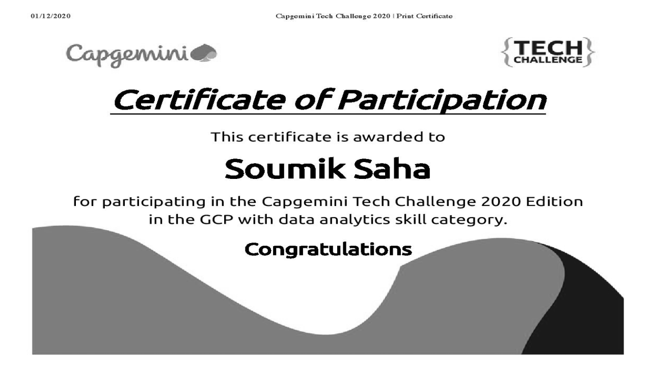 Cleared GCP with Data Analytics 1st round competition organised by Capgemini out of more than 50K+ participants organised by Capgemini.